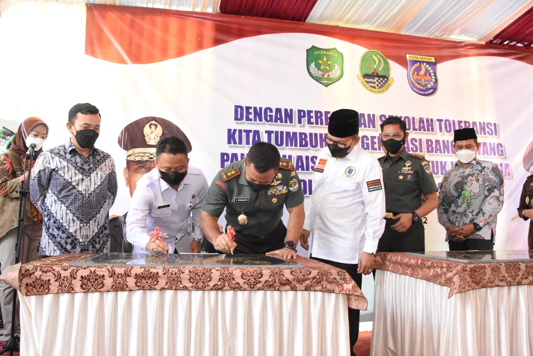 Siaranindonesia-Pangdam Jaya Mayjen TNI Untung Budiharto, berkunjung ke SMAN 1 Depok dalam rangka acara Peresmian Sekolah Toleransi, Bertempat Jl. Nusantara Raya No 317 Rt 05 Rw 014 Kecamatan. Pancoran Mas Kota Depok, Rabu (20/04/2022).