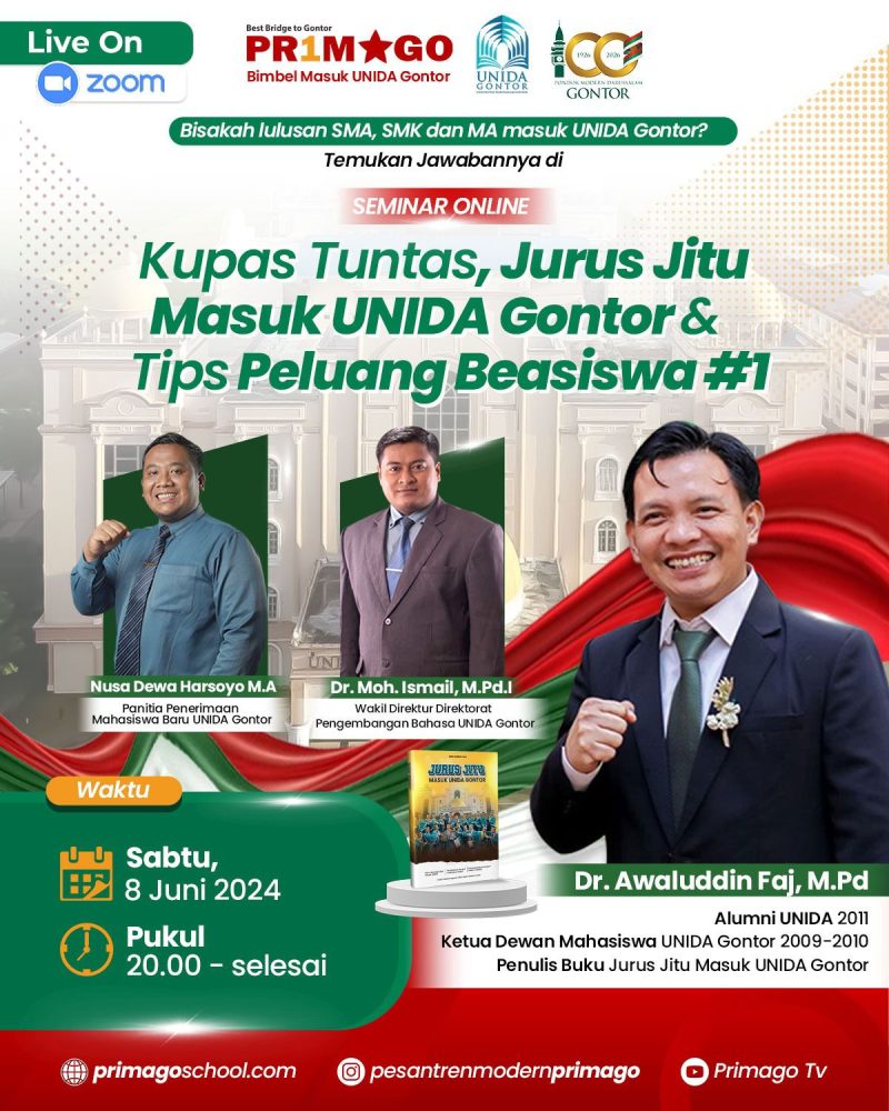Untuk itu, Bimbel Primago bekerja sama dengan alumnus Unida Gontor, Panitia Penerimaan Mahasiswa Unida Gontor, dan Direktorat Pengembangan Bahasa Unida Gontor menggelar seminar online bertema Kupas Tuntas, Jurus Jitu Masuk Unida Gontor & Tips Peluang Beasiswa.