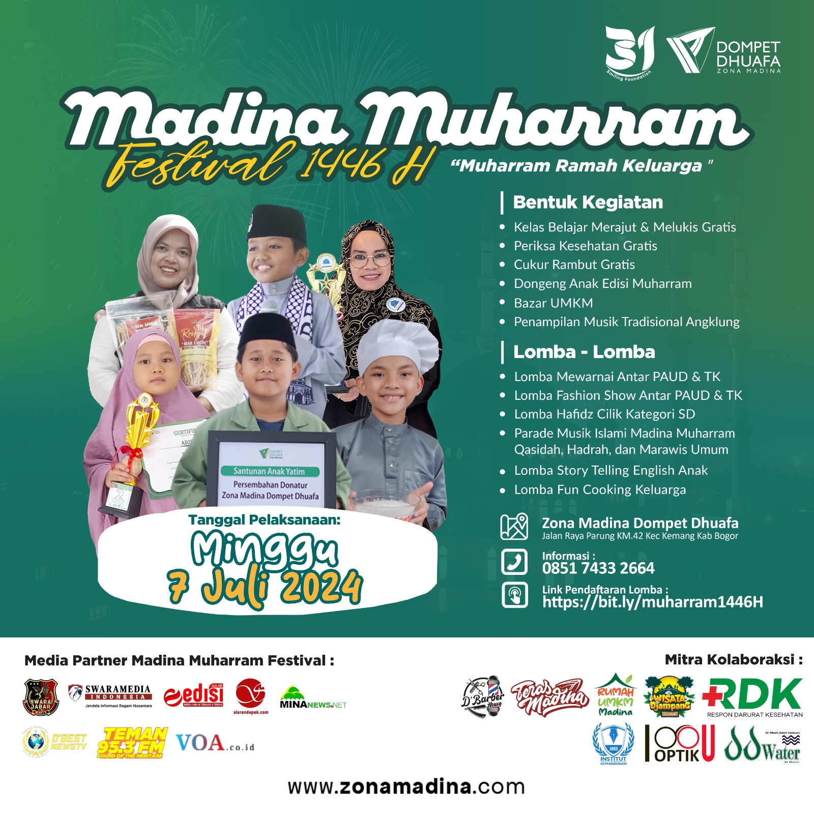 Zona Madina Bersama jejaring Dompet Dhuafa diantaranya LKC Dompet Dhuafa, dan Institut Kemandirian, turut menghadirkan layanan unggulan gratis diantaranya cek Kesehatan gratis, cukur rambut gratis, dan pelatihan merajut dan melukis gratis pada kegiatan Madina Muharram Festival 1446 H. Layanan ini disamping untuk memeriahkan kegiatan, juga mendekatkan masyarkakat kepada program-program unggulan Dompet Dhuafa yang telah hadir ditengah-tengah masyarakat, sehingga terciptanya ruang interaksi dan kolaboraksi baru.