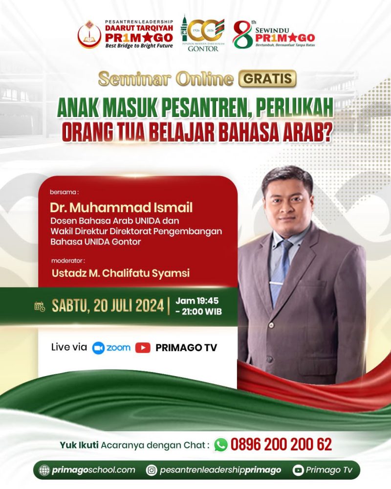 Maka dari itu, Pesantren Leadership Daarut Tarqiyah Primago Depok dalam rangka sewindu Pergerakan PRIMAGO adakan seminar online seputar Perlukah Orang Tua Belajar Bahasa Arab?