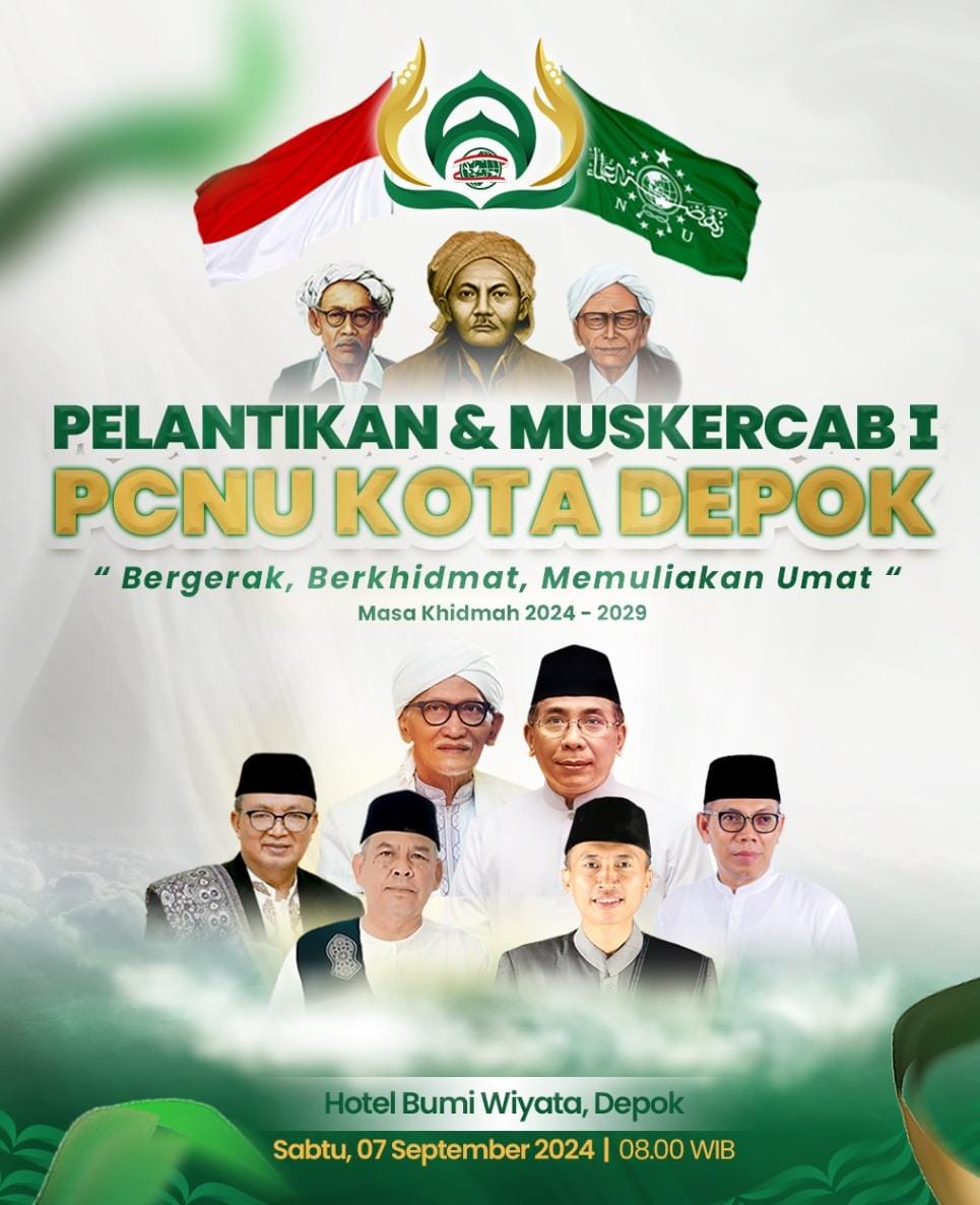 Siaranindonesia.com, DEPOK – Pengurus Cabang Nahdlatul Ulama (PCNU) Kota Depok akan menyelenggarakan Pelantikan dan Muskercab I. Pelantikan PCNU periode kepengurusan 2024-2029 akan dilaksanakan pada Sabtu, 7 September 2024 mulai 08.00 WIB.