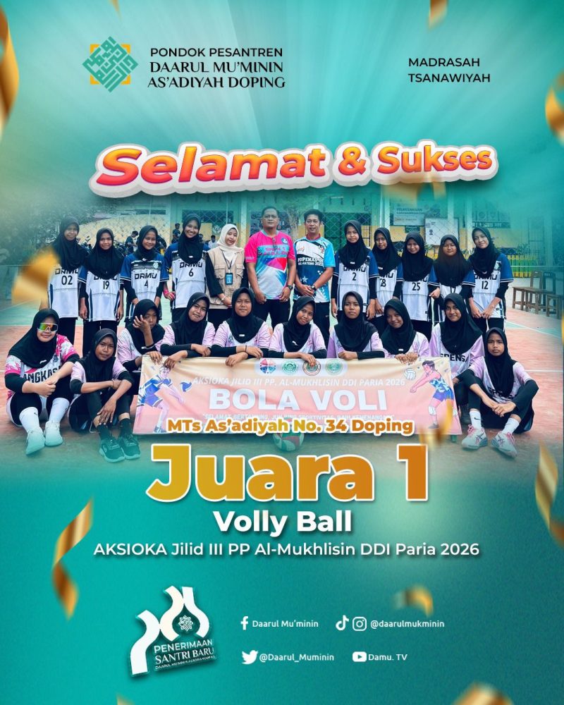 Dalam ajang bergengsi Aksioka Jilid III 2026 di Ponpes Al-Mukhlisin DDI Paria, srikandi-srikandi MTS As’adiyah no 34 Wajo berhasil menyabet Juara 1 setelah menumbangkan lawan kuat di partai final.